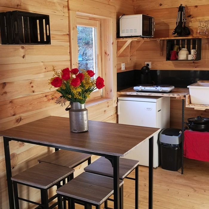 Cette cabane est tout confort avec kitchenette, salle d'eau et terrasse privée pour un séjour des plus agréables. Vous aurez accès à la piscine au sel en saison, terrain de pétanque et aire de jeux pour enfants.