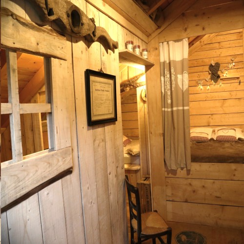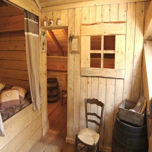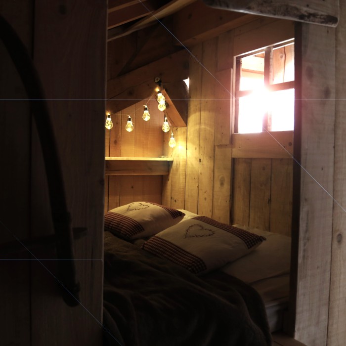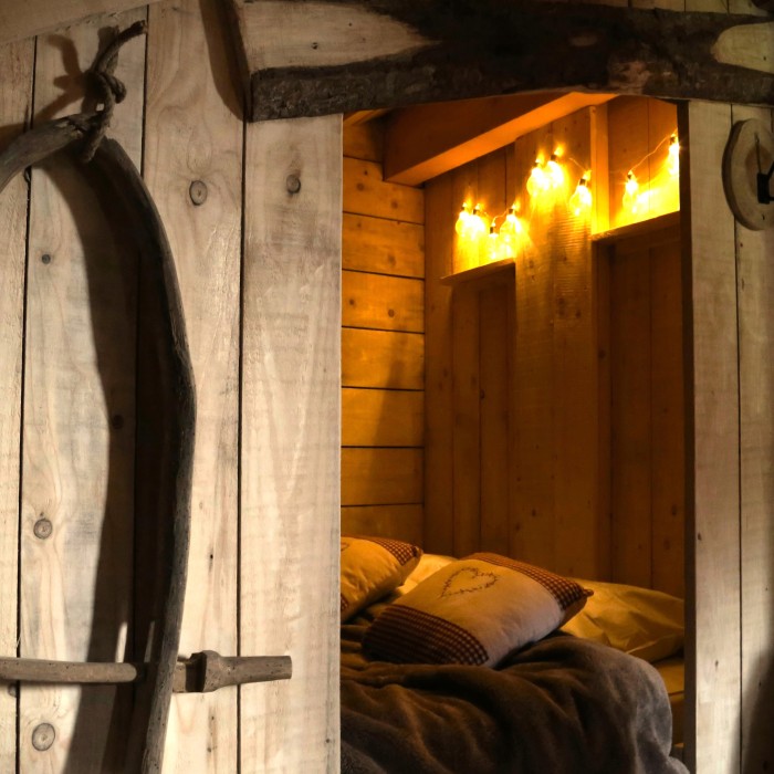 Passer la porte, vous allez retrouver l’ambiance des greniers d’autrefois avec quelques objets souvenirs du temps passé. Pour y passer une douce nuit, un lit de bois tout en alcôve vous attend ou encore deux cabanes de planche pour les enfants.